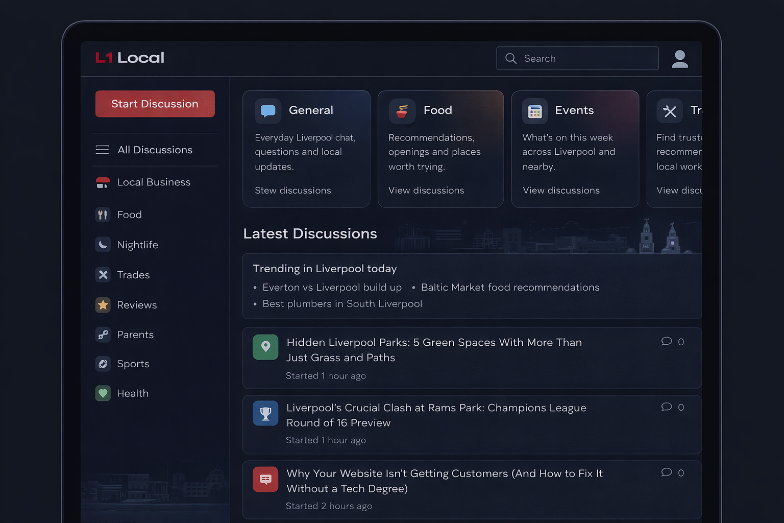 A full community platform connecting people across Liverpool — discussions, local business directory, events. Built from an idea the founder nearly shelved three times.